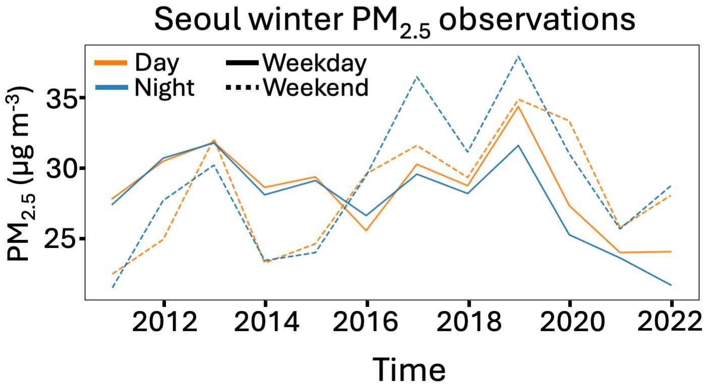 Seoul particulate matter trends in winter over time. Pollution gets worse in the 2015-19 period, especially at night (blue) and on weekends (dotted)