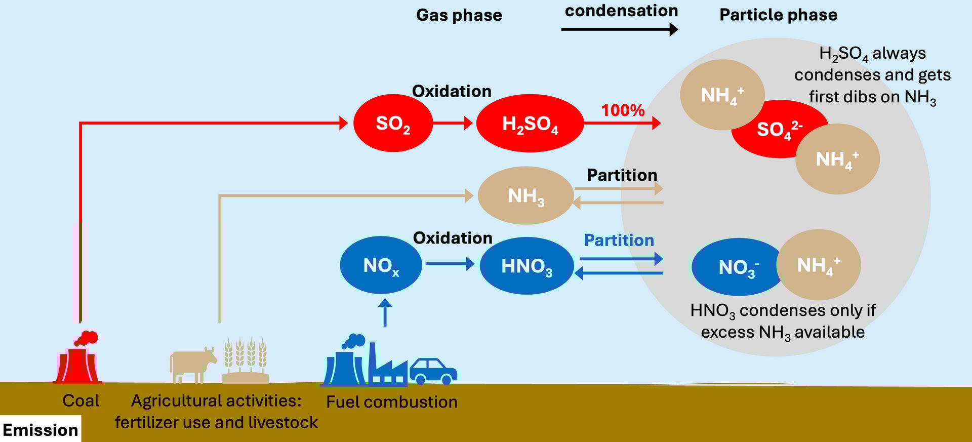 Coal burning releases SO2, which the atmosphere oxidizes into sulfuric acid (H2SO4), as in the top red line of the diagram. Sulfuric acid has very low volatility, which means that it really wants to condense into small particles of sulfate (SO42- ). In fact, it pretty much always condenses, and very quickly.