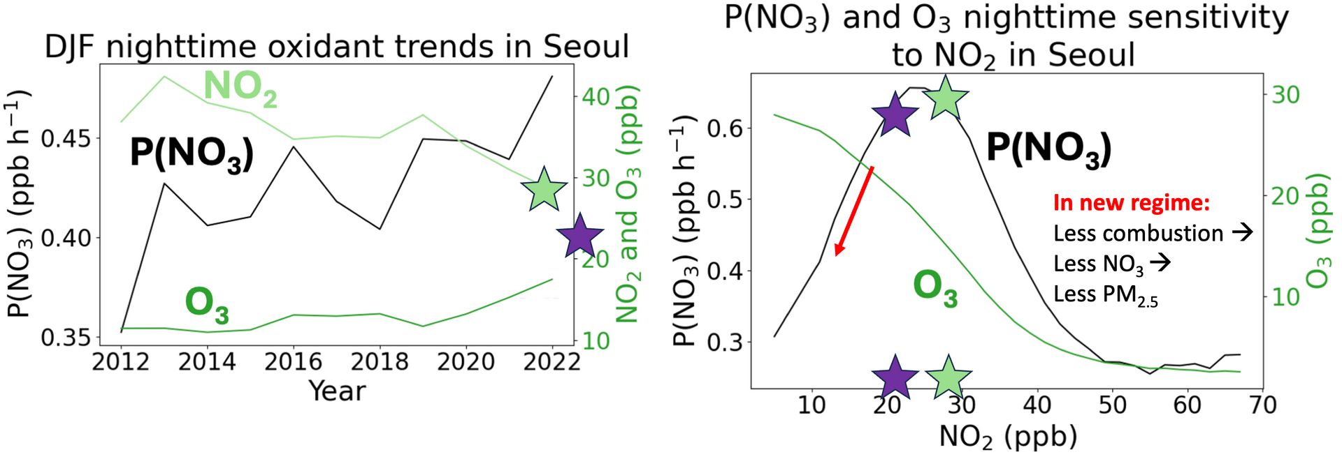 The atmosphere in South Korea started at the far right of the above plot, because NO2 pollution was very substantial. As Korean regulators cut NOx emissions, NO2 fell both during the day and at night, as shown in the left side of the below figure. However, this fall in NO2 came with an increase in nighttime ozone, which led the production rate of the nitrate radical P(NO3) to rapidly accelerate. We are climbing our P(NO3) radical production hill from the right.